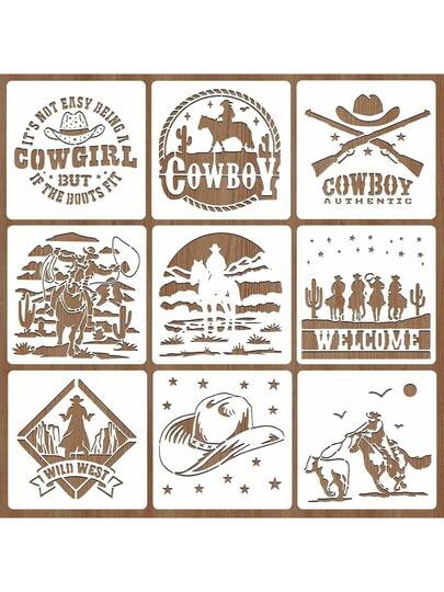 9 件牛仔风格绘画模板 7.9x7.9 英寸可重复使用模板,适用于画布、纸张、织物、地板、墙壁和瓷砖上的绘画,返校用品 - 白色 - 查看 1