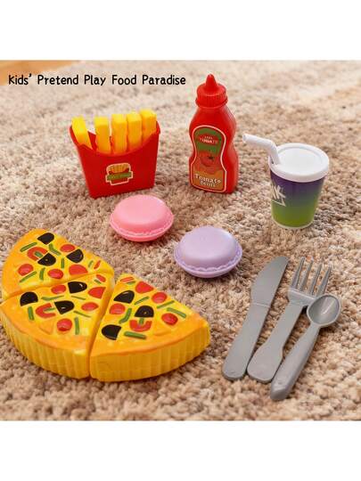 9件套披萨薯条玩具套装,包含1个可切片披萨,儿童厨房玩具,适合儿童和幼儿作为过家家食物,是万圣节、感恩节和圣诞节的理想礼物。
