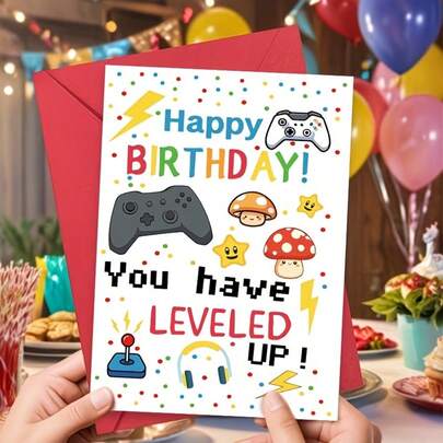 一张充满节日气氛的电子游戏主题生日贺卡:祝您生命中的游戏玩家生日快乐(来源)
