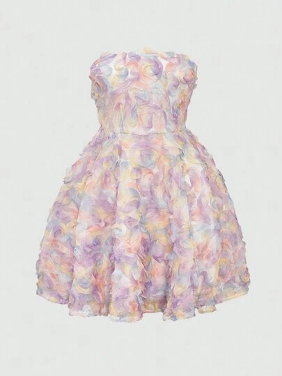 SHEIN Unity A字形露肩連身裙,腰間綴以花卉刺繡 - 紫色 - 查看 3