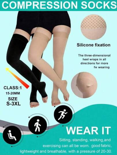 黑色加大码压缩袜,2级过膝裸色压缩袜,男女通用,裸色无趾不透明女袜,男士运动袜,女士多功能袜,硅胶固定,腿套,护膝,母亲节礼物,父亲节礼物,送给妈妈/爸爸的礼物