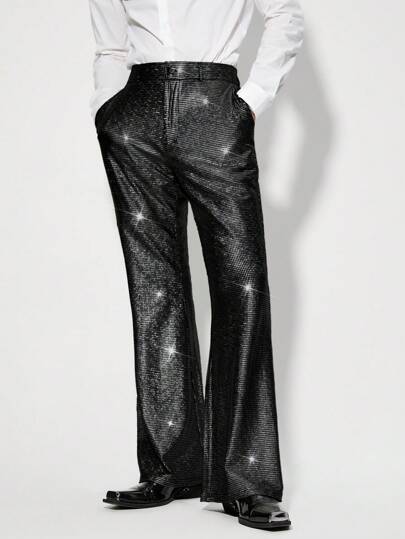 AKNOTIC Business Casual 男士时尚针织休闲银箔喇叭裤 - 黑色 - 查看 1