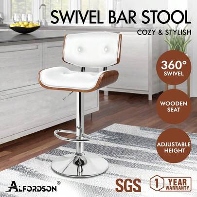 ALFORDSON Bar Stool, Height-Adjustable Swivel Kitchen Stool, Odette Wooden Counter Stool, Gas Lift, Buttoned PU Leather, Black