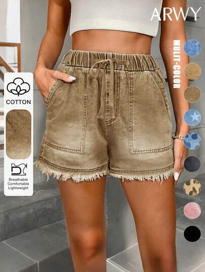 ARWY纯色休闲宽松抽绳女式牛仔短裤,适合日常、度假、海滩、旅行、所有季节、返校季、复活节、万圣节、圣诞节和夏季穿着。