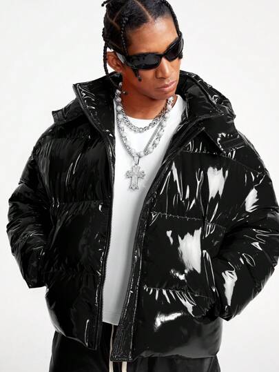 AXEPEAK 男式纯色亮面拉链连帽冬季夹克 - 黑色 - 查看 1
