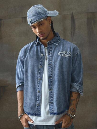 AXEPEAK 男士水洗贴布工艺时尚短款牛仔夹克,秋季 - 藍色 - 查看 1