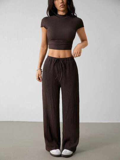 SHEIN PETITE 2 件套女士纯色短袖上衣和长裤套装,夏季时尚 - 棕色 - 查看 1