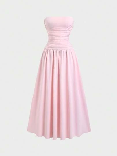 Sweetra 女士法式优雅时尚简约纯色褶皱露肩修身喇叭裙,休闲度假夏装 - 淺粉色 - 查看 1