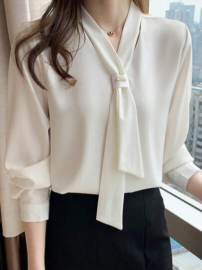 春秋蝴蝶结职业白色雪纺衬衫女上衣气质立领打底衫夏季 - 白色 - 查看 1