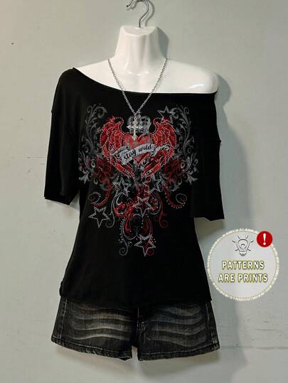 Attitoon 休闲心形翅膀图案宽松落肩女式 T 恤,适合夏季 - 黑色 - 查看 1