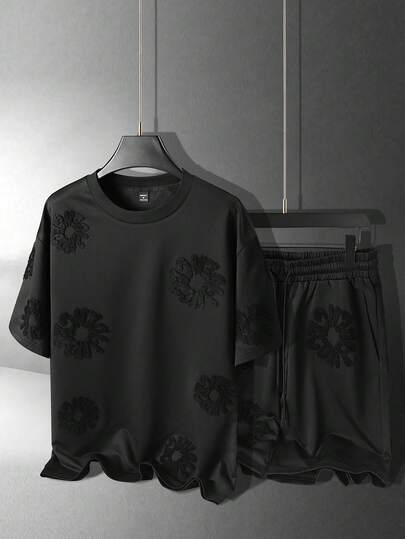 Aesthetic Post 男士印花圆领短袖T恤和短裤休闲套装 - 黑色 - 查看 1