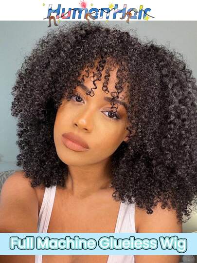 带刘海的非洲卷发假发 200% 密度无胶假发 女士非洲卷发巴西处女真人发刘海假发(8-16 英寸) - Natural Black - 查看 1