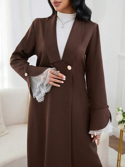 Al Najma 优雅翻领撞色袖口金属纽扣开衫 - 棕色 - 查看 1