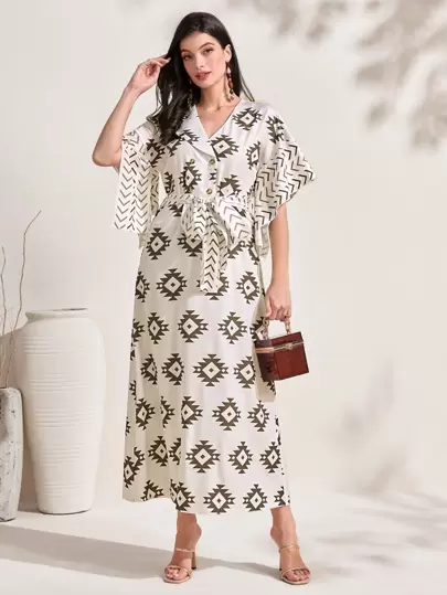 Al Najma 幾何印花蝙蝠袖腰帶土耳其長袍 - 杏色 - 查看 1