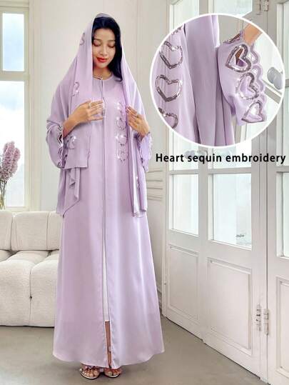 Al Najma 女士心形亮片拼布长袖阿巴亚和服 - 淡紫色 - 查看 1