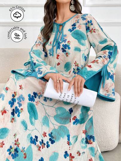 Al Najma 女士系带长袖开叉全印花端庄优雅阿拉伯连衣裙 - 藍色 - 查看 7
