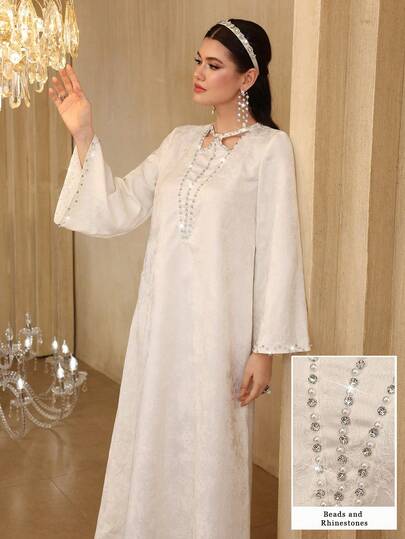 Al Najma 女士杏色提花长袖优雅水钻装饰宽松连衣裙 - 杏色 - 查看 4
