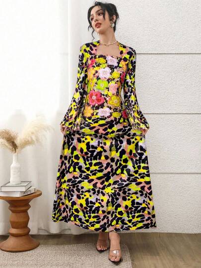 Al Najma 女式花卉豹纹喇叭袖优雅阿拉伯风格连衣裙