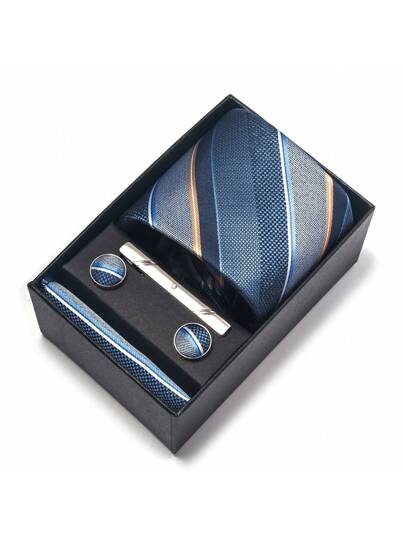 AlanKing 1 套男士条纹领带、手帕和袖扣礼盒套装,蓝色领带 7.5 厘米,适合节日、婚礼、工作男士领带 - HB317 - 查看 1