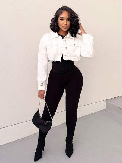 Alexandranx 前扣式有領長袖短牛仔外套,休閒日常穿著 - 白色 - 查看 6