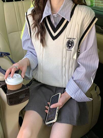 Alicedudu 拼接邊麻花編織毛衣背心 - 米色 - 查看 7