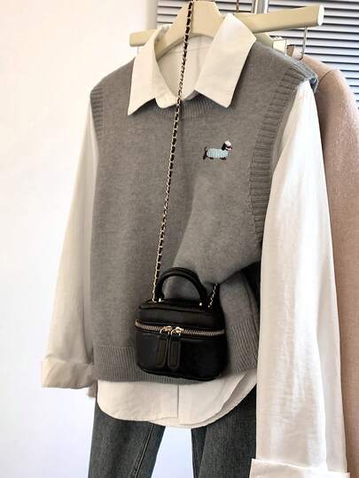 Alicedudu 女式卡通图案圆领套头背心,秋冬 - 灰色 - 查看 1