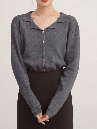 Alicedudu 女式简约法式领仿门襟套头衫,秋冬 - 灰色 - 查看 1