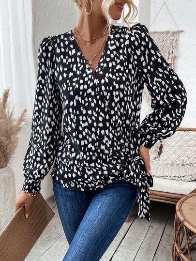 SHEIN Clasi 全身印花燈籠袖正面繫帶襯衫 - 黑與白 - 查看 5