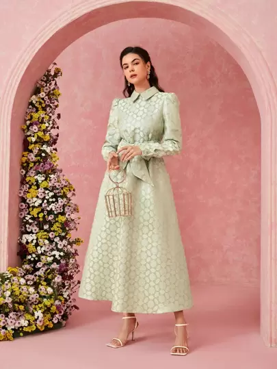 Modelyn 滿版提花圖案泡泡袖繫腰帶連衣裙 - 青檸色 - 查看 1