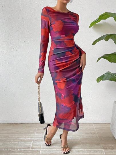 Chiquease 全身印花褶饰网眼连衣裙 女式长款连衣裙 女式秋季服装 - 彩色 - 查看 1