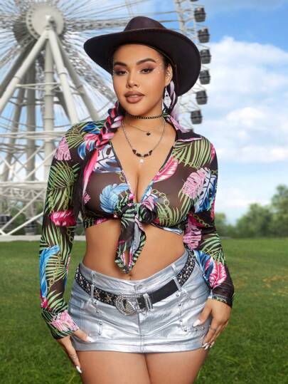 Allurite 女士植物圖案蝴蝶結前扣上衣 - 彩色 - 查看 1