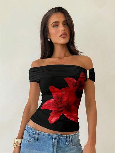 Aloruh 不对称肩部金属装饰性感度假百合花印花针织T恤上衣,黑色印花衬衫,复古优雅休闲性感上衣,春季印花T恤,百搭优雅黑色打底衫