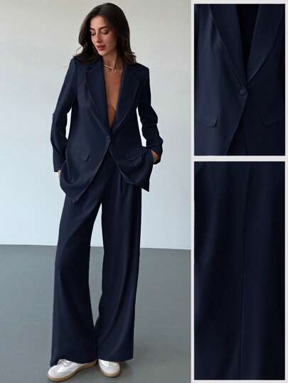 Aloruh 新款优雅通勤西装套装廓形设计长款外套秋冬四季 - 藏蓝色 - 查看 1