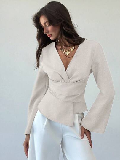 Aloruh 全新时尚通勤腰部褶饰不对称下摆长喇叭袖 V 领套头衫 - 米色 - 查看 1