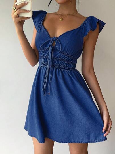 Aloruh 女士牛仔迷你连衣裙,休闲修身,蓝色 - 中等水洗藍 - 查看 7