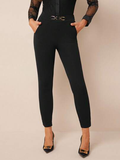 Amorya 女式高腰金属扣细节紧身裤 - 黑色 - 查看 1