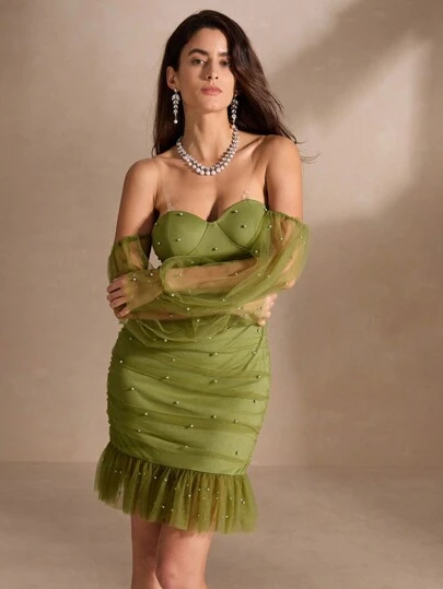 Anewsta 定制女士荷葉邊網紗氣球袖派對裙 - 綠色 - 查看 1