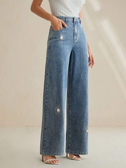 Anewsta 时尚女式水钻口袋休闲阔腿牛仔裤 - 藍色 - 查看 1