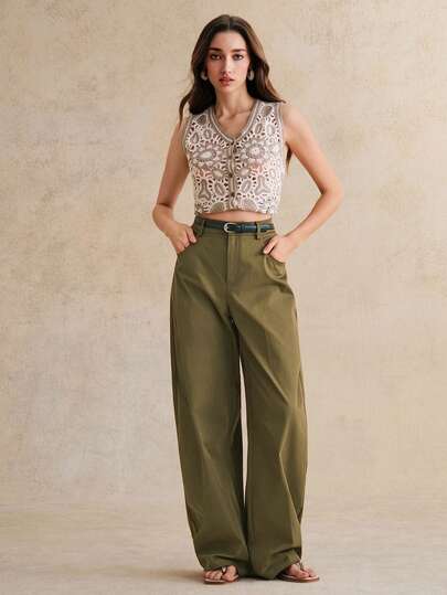 Anewsta 春季新款女式橄榄绿长裤,时尚百搭,配腰带,休闲筒裤 - 橄欖綠 - 查看 1