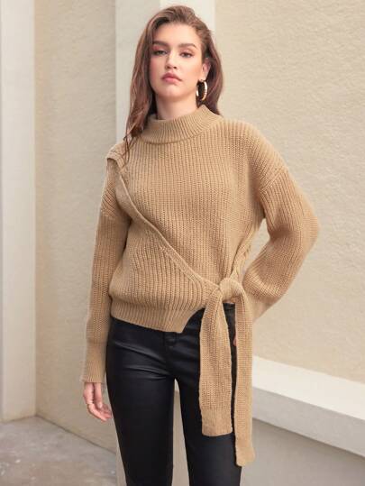 Anewsta 立领侧边打结针织套头衫秋冬毛衣 - 卡其色 - 查看 1