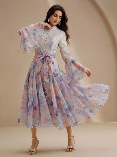 Anewsta 女士优雅度假宽松喇叭袖收腰印花长袍,适合节日、庆典等场合,休闲卡夫坦长袍 - 紫色 - 查看 1