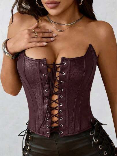 Apperloth A 性感过胸束身胸衣 PU 皮革带骨露脐抹胸上衣 女士系带前开后露背塑身衣 万圣节服装 感恩节服装