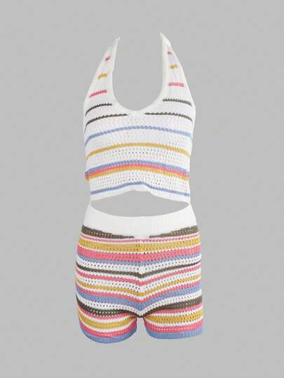 Apperloth A 女士Y2K彩虹条纹露背V领镂空钩针编织短款上衣和紧身短裤,春夏音乐节和海滩度假套装 - 彩色 - 查看 1