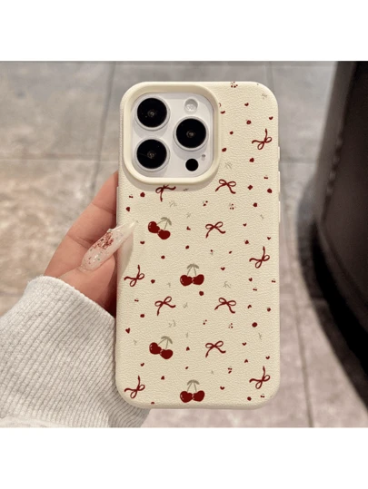 苹果全新创意淑女全印樱桃蝴蝶结荔枝纹柔软触感高端防摔皮革保护手机壳,适合美女,兼容iPhone 16/15/15Pro/15ProMax/14/13/12/11/XsMAX系列 - 白色 櫻桃蝴蝶結 - 查看 4