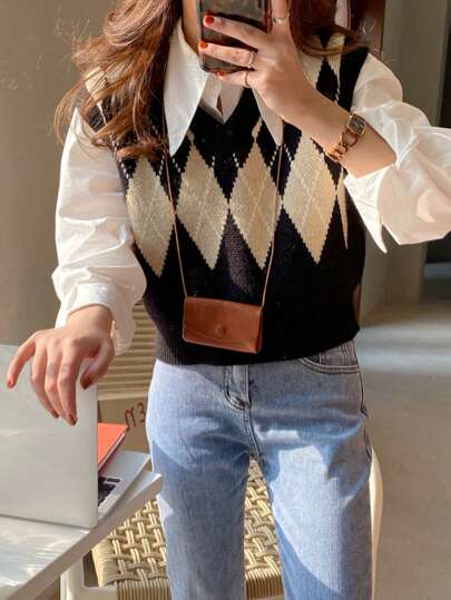 菱形印花毛衣背心 - 黑色 - 查看 1