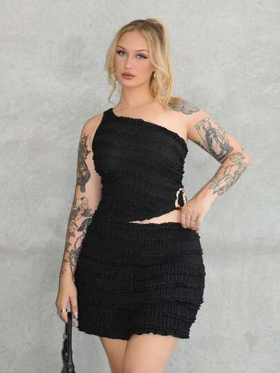 Arliah 性感装扮 - 不对称领口上衣 + 荷叶边迷你裙 - 黑色 - 查看 1