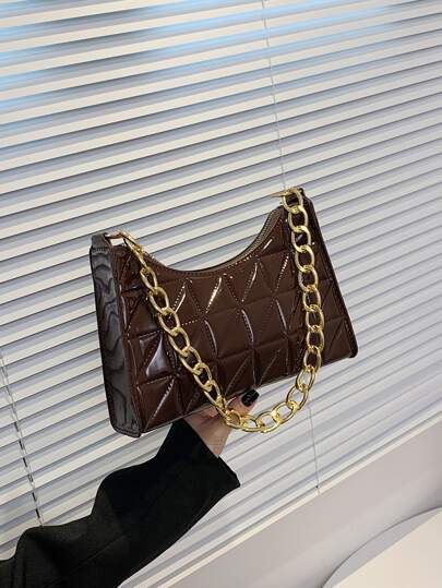 人造漆皮幾何衍縫鏈條法棍包 - 咖啡棕 - 查看 1