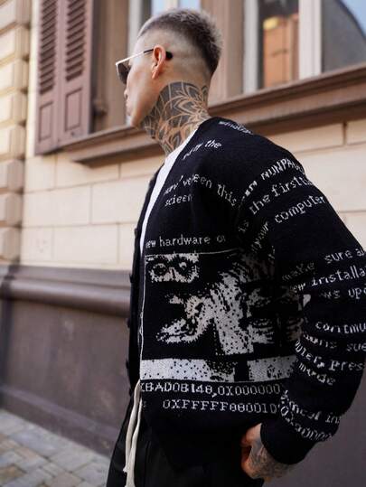 Artur Kramer 男女皆宜的复古抽象字母图案针织长袖开衫,休闲欧美亚洲风格,适合春、秋、冬三季穿着。 - 黑色 - 查看 6