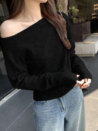 不对称领口 女士不对称领口针织毛衣,秋冬 - 黑色 - 查看 1