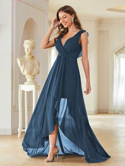 不对称褶饰雪纺优雅伴娘礼服 - 霧霾藍 - 查看 1